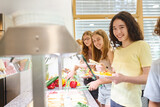 Smiling teenagers enjoying drinks together in a school cafeteria setting