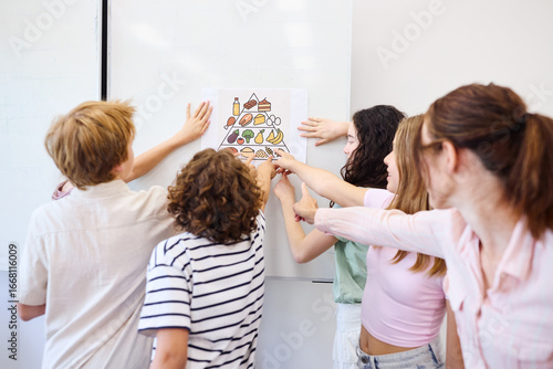 Teenagers discussing nutrition and healthy foods in a school classroom setting