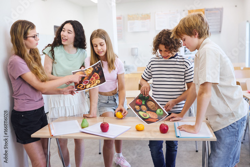 Teenagers discussing nutrition and healthy foods in a school classroom setting