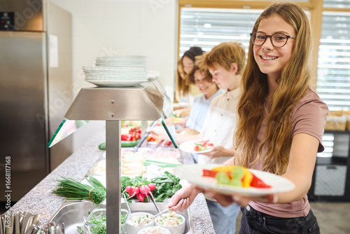 Students enjoy a meal served by a smiling adult in a school cafeteria