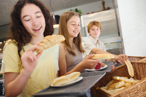 Students selecting fresh bread in a school cafeteria line with positive atmosphere