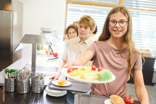 Students enjoying healthy meals together in a modern school cafeteria setting