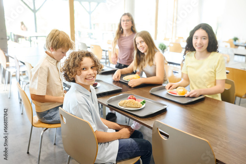 Children enjoying lunch together in a school cafeteria with healthy meals