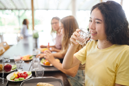 Smiling teenagers enjoying drinks together in a school cafeteria setting