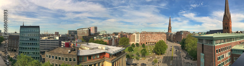 Panoramic cityscape view with buildings, spires, and blue sky under calm conditions
