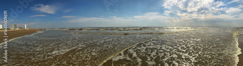 Wide panoramic view of a sandy beach and tranquil ocean waves