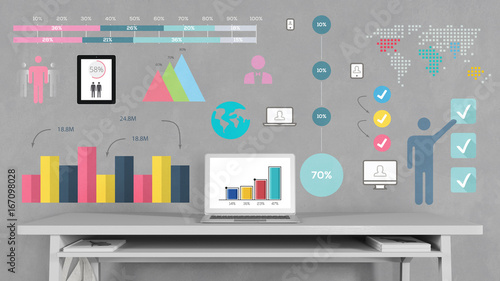 Schreibtisch vor vielen bunten Diagrammen an einer Wand