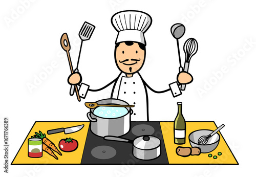 Cartoon Koch am Herd in Küche zeigt Küchenhelfer