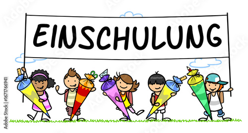 Viele Kinder mit Schultüte halten Schulanfang Banner