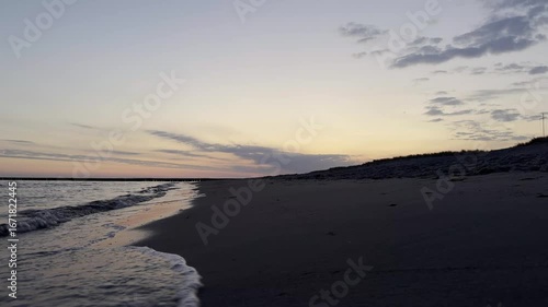 Tracking shot of sunset over the Baltic Sea: tranquil beach scene in Graal-Müritz, Germany.