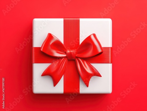 Elegant white gift box with red ribbon bow on a red background, perfect for gifts