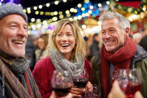 Warm mulled wine with bokeh lights at an outdoor Christmas market