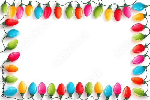 Brightly colored Christmas lights forming a rectangular frame on white background