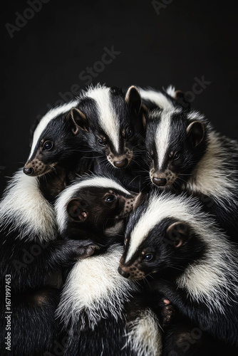 Close up of a group of young skunks in natural light