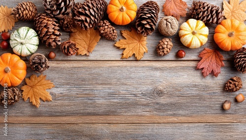 Rustic wooden background adorned with autumn leaves, pumpkins, and pinecones