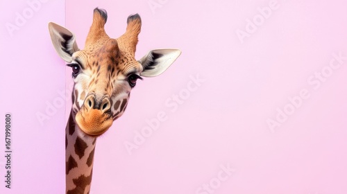 Giraffe curiously peeking out from behind a pastel pink wall corner