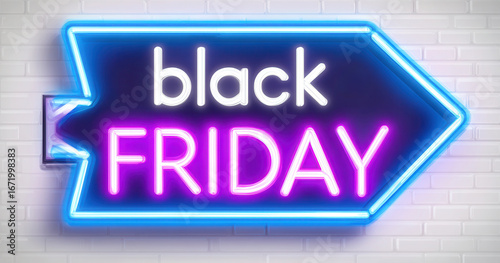 Black Friday neon sign with glowing colorful letters and arrow design