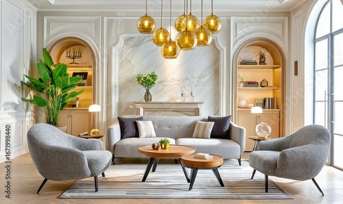 A beautiful living room interior featuring a gallery wall with framed art and cozy decor