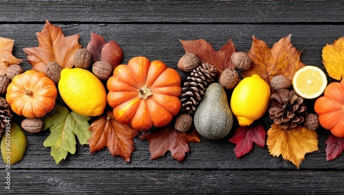 Autumn arrangement with pumpkins, leaves, walnuts, and lemons on wooden surface