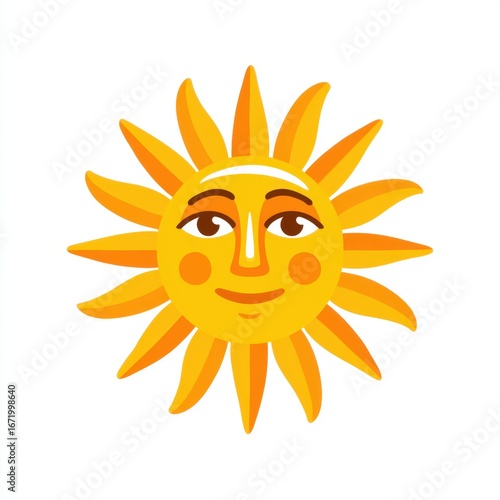 Smiling sun surrounded by fluffy white clouds on a bright yellow background