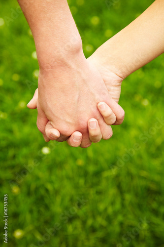 Hände geben Handschlag vor grüner Natur als Deal Konzept