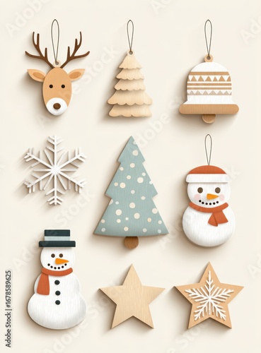Set of wooden Christmas ornaments featuring festive designs on white background