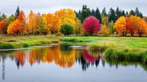 Scenic autumn landscape with colorful trees reflected on a tranquil pond surface