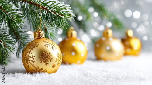 Golden baubles on snow with fir branches in a festive Christmas setting