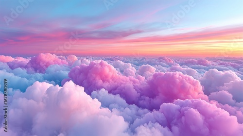 Dreamy pastel sunset over fluffy pink clouds in a colorful sky at the horizon
