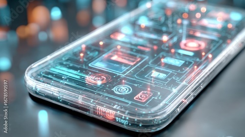 Futuristic smartphone displaying advanced AI interface with holographic visualization