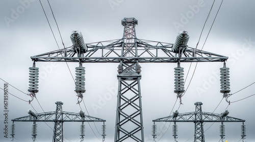 High voltage electrical transmission towers against a dramatic cloudy sky