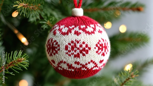 Knitted red and white ornament hanging on a festive Christmas tree branch