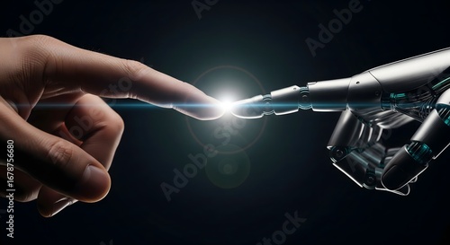 Human hand and robotic arm in a symbolic touch, representing technological partnership and innovation in business