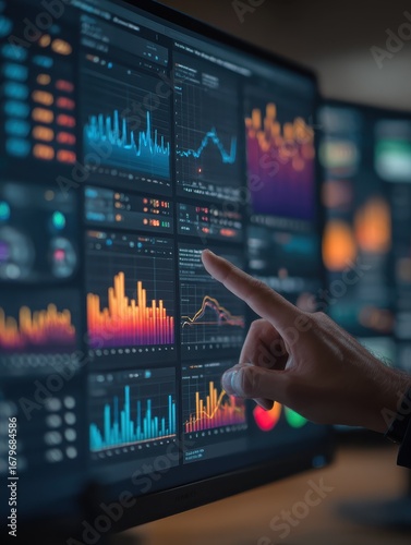 High-tech business analytics dashboard displayed on a widescreen monitor in a modern office setup.