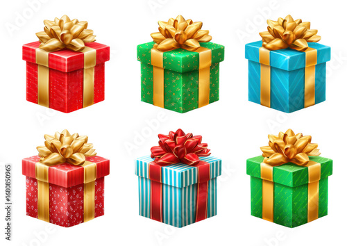 PNG colorful wrapped gift boxes with gold ribbons and bows for celebrations