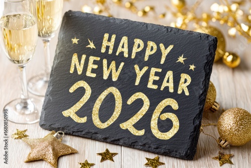 Festive New Year 2026 celebration with champagne glasses and gold decorations