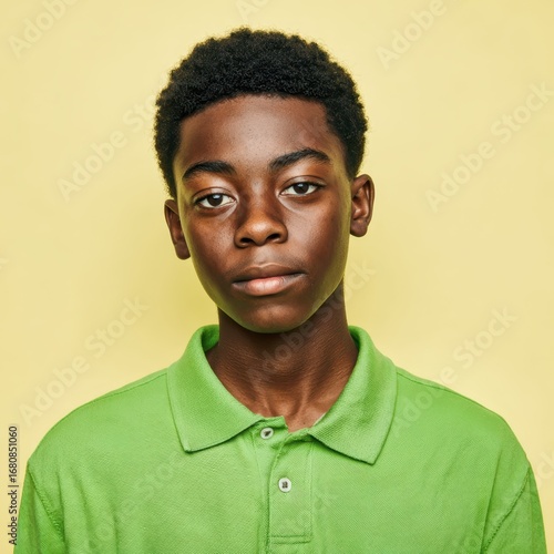 Confident Angolan teenage boy in a green shirt on a yellow background