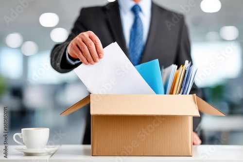 Businessman packing personal belongings into box at workplace in office setting