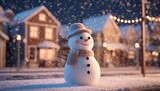 Cheerful snowman in winter village with festive holiday lights and snow falling