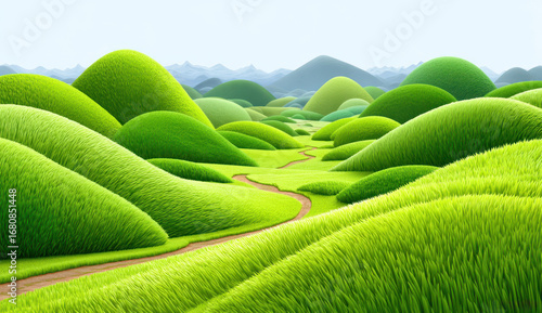 Green landscape featuring rolling grassy hills and a winding path
