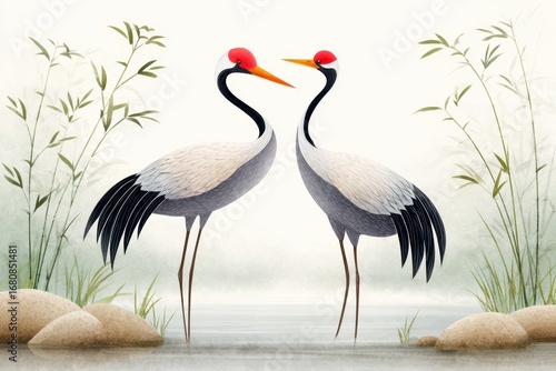 Elegant cranes in a serene traditional Asian landscape with red trees