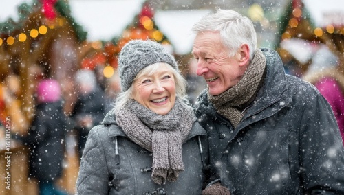 Smiling senior couple enjoying wintertime at a festive outdoor market