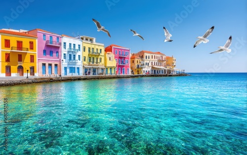 Colorful Waterfront Buildings and Seagulls over Clear Blue Sea