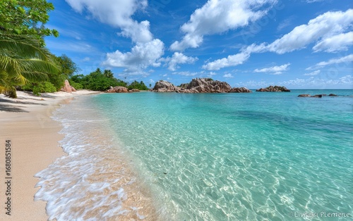 Pristine beach with turquoise waters and palm trees on Seychelles