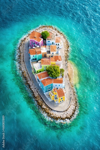Aerial view of colorful houses on a small island surrounded by turquoise water