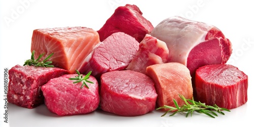 Assorted fresh raw meat cuts with rosemary garnish on a white background