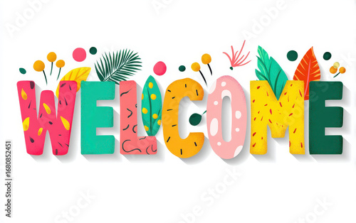 Colorful artistic welcome message with playful letters and tropical leaf accents