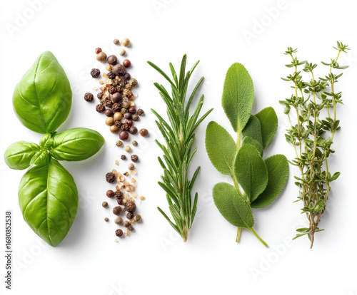 Flat lay of fresh green herbs including basil, thyme, and rosemary
