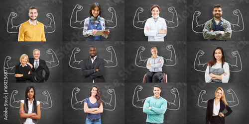 Portraits vieler Branchen mit Muskel Armen als Karriere Konzept