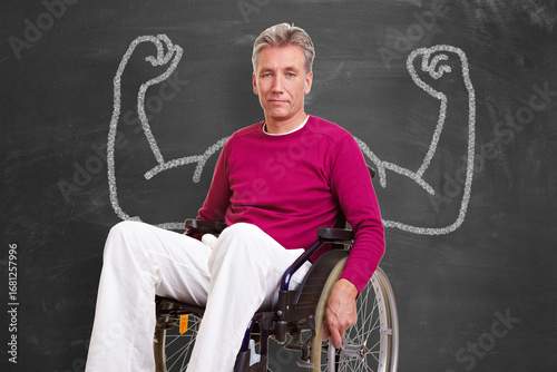 Zufriedener Senior als Rollstuhlnutzer mit Muskel Armen